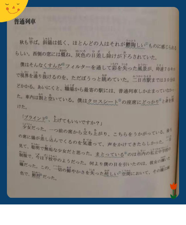 通過灰暗的窗簾,我呆呆地望著窗外,已盡失色彩地風(fēng)景以時(shí)速70公里地速度不斷出現(xiàn)在視野中。到二日市大約需要30分鐘。不巧的是離公司近的車站只有慢車,車廂內(nèi)很空。我撲通一聲重重地坐在了橫排座椅上。