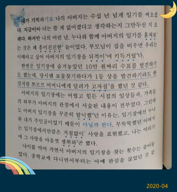 小時候,我以為日記的主人公是我和姐姐,而實際上爸爸才應(yīng)該是日記的主人公。而且,日記中的爸爸看起來異常孤單疲憊。那個曾經(jīng)偷看爸爸日記的兒子現(xiàn)在也已經(jīng)30多歲了,每當(dāng)我為生活而感到疲憊的時候,我都會想起爸爸的日記。